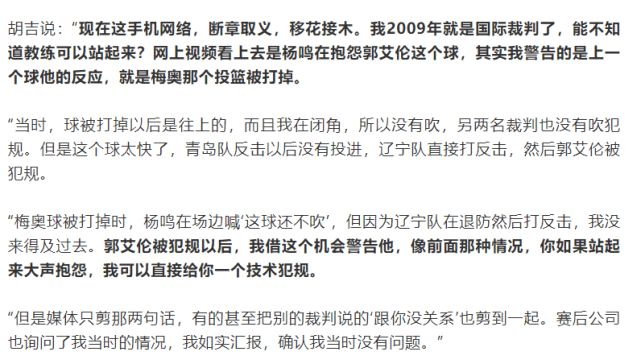该裁判还表示赛后CBA公司也询问过这个事情,但他说出事情原委后,CBA公司也认为他没有问题。从这段描述来看,球迷们又一次错怪裁判了。杨鸣可能也会错了意,以为是对郭艾伦事情的抱怨不被允许,事实上是因为此前梅奥的事情导致裁判过来和他交涉。