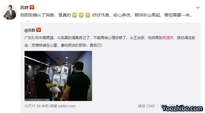 今日,篮球媒体人苏群更新了微博,谈到阿联的伤势:“我刚刚确认了消息,是真的。好好休息,安心养伤,期待东山再起,哪怕需要一年。”