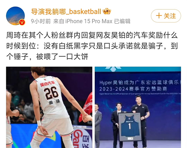 周琦吐槽广东男篮赞助商 豪车承诺未兑现