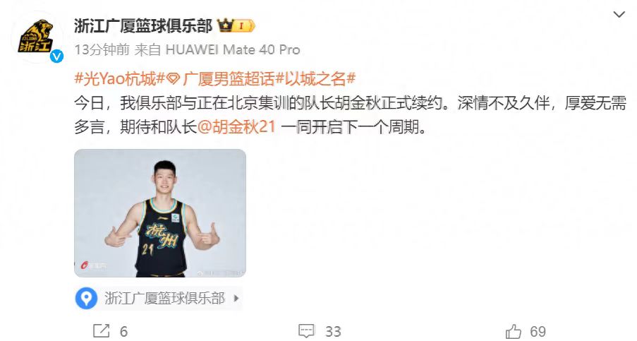 果不其然,28日,浙江广厦官宣,俱乐部和正在北京集训的队长胡金秋正是需要,深情不及久伴,厚爱无需多言,期待和队长胡金秋一同开启下一个周期。根据报道,此次浙江广厦是诚意十足,他们给胡金秋开出了一份3年的顶薪合同,不得不说,浙江广厦的这份合同还是很有人情味,3年的合同结束,胡金秋的年龄来到了30岁,届时的胡金秋正好还在生涯的巅峰期,他依旧可以签下一份3-4年的顶薪,这能够最好的保障胡金秋的权益,当浙江广厦拿出诚意的时候,胡金秋怎么可能离开呢?
