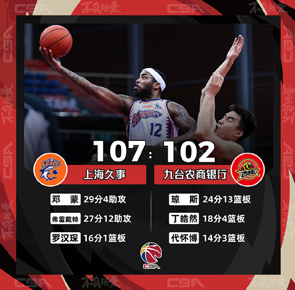 24直播网12月26日讯 CBA常规赛第23轮比赛继续进行,两连胜的上海迎战两连败的吉林,刘炜代替因病缺席的斯帕夏场边执教,姜宇星本场伤愈复出,首节一上来两队陷入僵持,中段吉林连中三分拉开比分,首节结束,吉林暂时领先8分,次节回来后上海双外援轮番冲击,率队连续打出得分高潮,半场战罢,上海反超对手2分。易边再战后双方进攻稍显停滞,上海末段找回状态,再次打出9-0小高潮拉开比分,三节结束,上海已经领先12分,末节上来后丁皓然单节飚中四记三分,关键时刻弗雷戴特连中三分,罗汉琛飚中关键三分,吉林最后阶段追分未果,最终上海107-102力克吉林迎来三连胜。