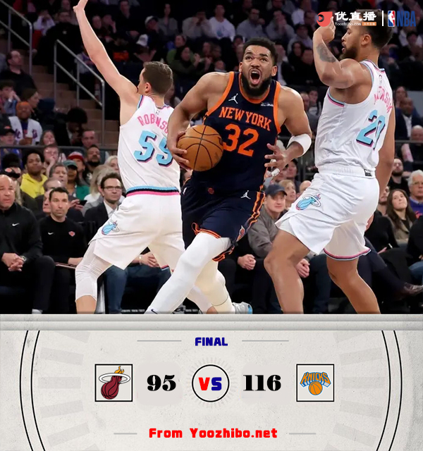 24直播网讯北京时间3月18日 NBA常规赛激战正酣,热火和尼克斯两支东部球队正面对话,热火目前苦吞7连败,29胜38负排在东部第9位,尼克斯42胜24负稳居东部第三。首节开打后热火反客为主,邓肯-罗伯逊里突外投率队轰出12-0开局,布里奇斯连投带罚稍稍止血,但希罗续上火力,首节结束时热火确立11分优势,次节回来,唐斯突然爆发单节贡献15分,尼克斯一波15-2一度反超,末段两队你来我往陷入僵持,半场战罢,热火依然领先2分。易边再战后热火进攻再度停滞单节仅得到15分,尼克斯顺势反超扩大优势,三节结束后尼克斯已经领先24分,末节上来,热火无法打出追分高潮,比赛提前失去悬念,最终尼克斯116-95大胜送热火8连