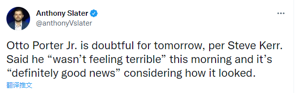 西决G3,奥托-波特在一次上篮落地后左脚感觉不适被替换下场,一瘸一拐返回更衣室,之后波特的X光检查结果为阴性,所幸左脚没有骨折;今日科尔表示奥托-波特明日G4将大概率缺阵,科尔还说奥托-波特今早“感觉并不糟糕”,这绝对是个好消息。