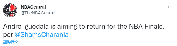 据名记Shams报道,勇士38岁老将伊戈达拉的目标是在总决赛复出;目前他正在努力进行恢复训练,力争能在总决赛完成复出,此前因伤已经连续缺席11场比赛。