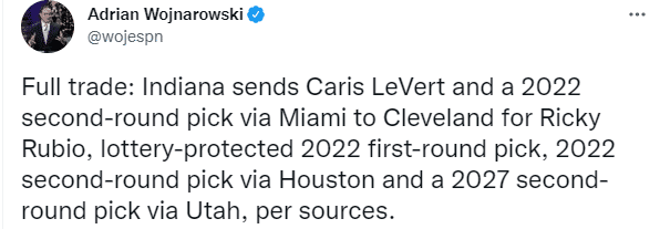 骑士送出卢比奥、2022年首轮选秀权(乐透保护)、2022年次轮选秀权(来自火箭)以及2027年次轮选秀权(来自爵士);从步行者得到勒维尔以及2022年次轮选秀权(来自热火)。