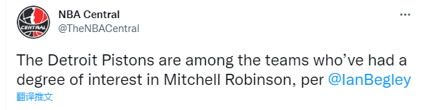 据纽约记者Ian Begley报道,活塞是联盟中有意尼克斯中锋米切尔-罗宾逊的球队之一,23岁罗宾逊本赛季为尼克斯首发出战39场比赛,场均拿到8.4分8.5篮板1.6盖帽。
