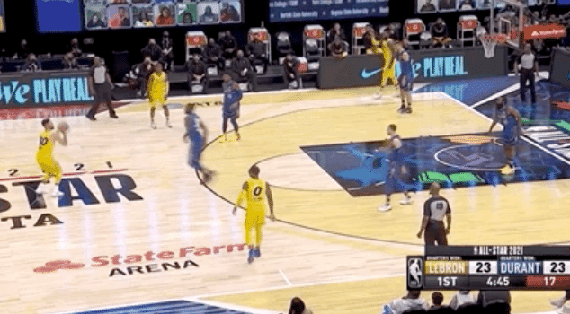 从比赛初期,刚刚拿下三分球大赛的库里和詹姆斯就有意连线,其中库里摘板之后长传球就是找的詹姆斯,可惜詹姆斯没有防守的情况下失误出界了。当库里投进空位三分球之后,两人在回防的时候也是兴奋庆祝。