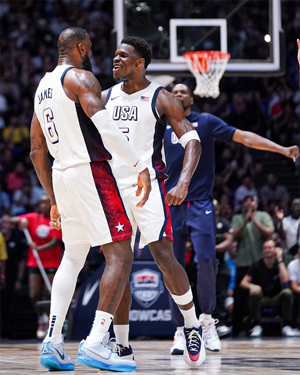 在美国男篮击败德国男篮的最后时刻,比赛还剩45秒,詹姆斯持球杀到禁区强硬得分,带领美国队领先到6分;老詹达成制胜一击,疯狂抖肩以及与爱德华兹撞胸庆祝,然后与杜兰特、恩比德以及库里等人击掌庆祝,詹姆斯成为全场的焦点。