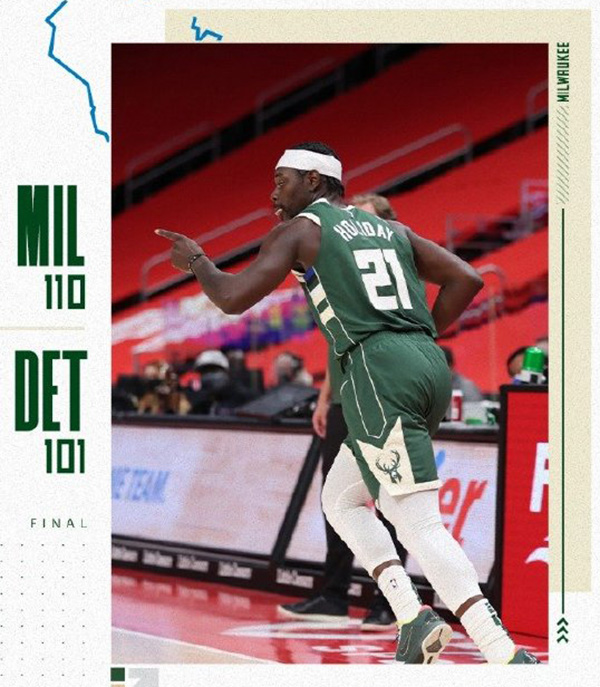 - 【集锦】[微博全场集锦] 字母哥22+10+10 霍勒迪21+6 雄鹿击败活塞取3连胜2021-01-14 10:40:22
