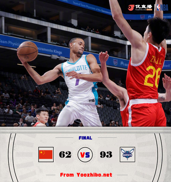 24直播网7月8日讯 中国男篮今日迎来加州夏季联赛的第二个对手黄蜂,中国男篮上一场面对国王惨败51分。首节之争中国男篮慢热迟迟找不到感觉,杨瀚森开局进球是中国男篮前8分钟里唯一运动战进球,末段邹阳的三分是这一节为数不多的亮点,首节仅得9分的男篮早早就落后对手9分。次节男篮及时回暖以一波7-3开局蚕食比分,这一节虽然占不到太大的便宜但单节净胜1分状态上升并带着16分劣势进入下半场。休息归来高诗岩上来一记三分外加2+1带队送出10-2的攻势追至个位数,杨瀚森节中的梦幻脚步和隔扣相当亮眼;不过后半段男篮状态重新回落被对手频频打出反击导致分差重新被拉开;这之后男篮也很难制造威胁,杨瀚森末段连续制造犯规是为数不多的亮点。最终,黄蜂79-57送中国男篮夏联两连败。