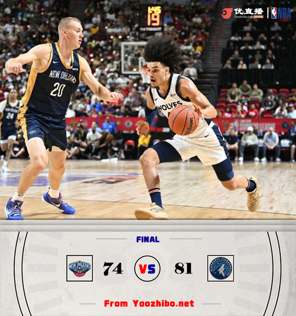 24直播网讯 7月13日NBA夏季联赛,鹈鹕对阵森林狼。森林狼球星唐斯和鹈鹕新援德章泰-穆雷均到现场观战。比赛开始,鹈鹕连投带罚先拿5分,森林狼一波9-0强势回应,此后双方陷入缠斗,比分交替领先,次节森林狼持续发力再度完成9-0的攻击波取得两位数优势,鹈鹕不断冲击篮筐频频得手迅速追赶,半场战罢鹈鹕40-45落后森林狼5分。易边再战,鹈鹕一波6-0很快反超,森林狼连投带罚稳住局势,末节鹈鹕内外开花再度反超,双方争夺陷入白热化,关键时刻香农持续发力帮助森林狼确立优势,鹈鹕苦苦追赶无果。最终,森林狼81-74力克鹈鹕。