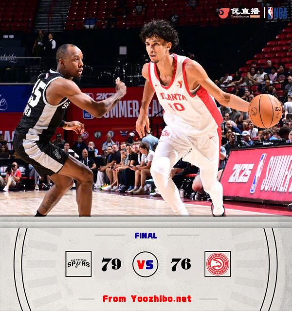 24直播网 7月15日讯 NBA夏季联赛,马刺今日对阵老鹰,前者取得两连胜,后者上场比赛则是输给了奇才,此役马刺4号秀卡斯尔缺战。比赛上来,两队短暂拉锯后马刺打出一波10-0的小高潮将分差拉开到两位数,但之后的两分钟时间里他们一分未得,老鹰连拿七分追了回来,次节双方继续保持拉锯,半场结束时马刺落后1分;下半场回来,两队依旧是打得难解难分,比赛悬念保持到了最后,关键时刻威廉姆斯利用破紧逼的机会拿到两分,随后马刺采用犯规战术不给老鹰绝平机会,最终马刺险胜老鹰,迎来三连胜。