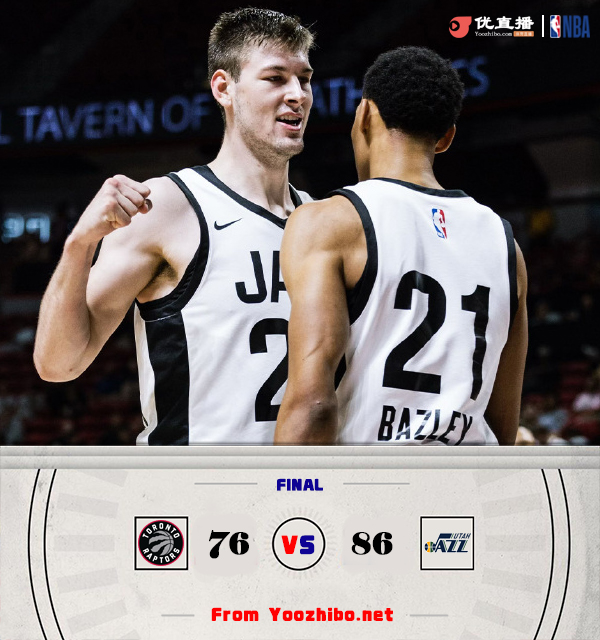 24直播网7月17日讯 NBA夏季联赛,爵士主场对阵猛龙。爵士选秀大会上主要摘得10号秀科迪-威廉姆斯、29号秀科利尔和32号秀菲利波夫斯基;猛龙则是19顺位选中沃尔特,31顺位选中莫格博,45顺位拿到谢德。比赛开始,爵士上来比较慢热,猛龙抓住机会打出7-0开局,亨德里克斯里突外投止血,随后2分钟内猛龙再打10-0建立主动权,亨德里克斯又是连追5分,首节爵士仅落后2分,次节猛龙打了3分多钟仅得2分,爵士一波小高潮反超比分,随后爵士接连外线发炮,单节23-10直接领先到11分。下半场,菲利波夫斯基接连取分,亨德里克斯继续保持自己的好状态,而猛龙则是利伯蒂苦苦支撑,三节爵士领先到17分,末节双方展开拉锯战,猛龙后半节一波9-0追至个位数分差,金西暴扣止血,爵士还是掌握住10分左右领先,最终爵士86-76力克猛龙。