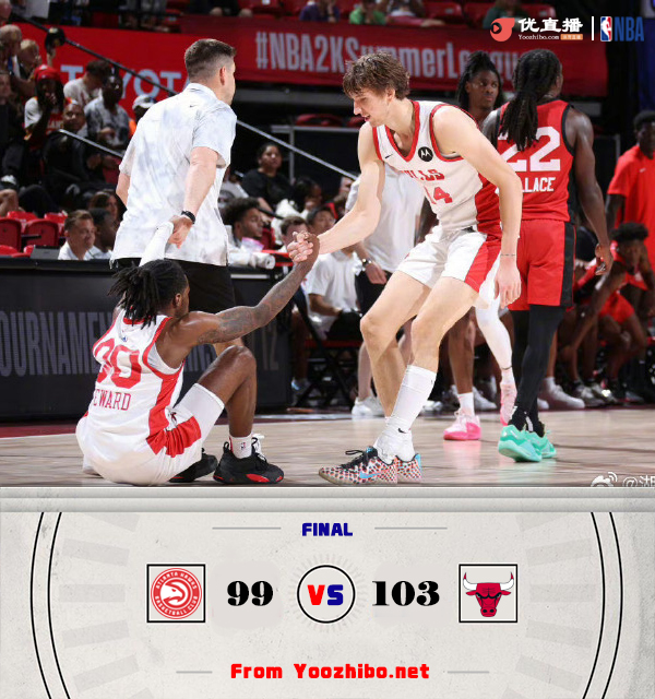 24直播网 7月20日讯 NBA夏季联赛,老鹰对阵公牛。选秀大会上老鹰摘得状元秀里萨谢,而公牛拿到11号秀布泽利斯。本场比赛里萨谢缺阵。比赛开始,公牛率先发力打出9-2开局,随后老鹰接连三分追分,斯图尔特手感火热外线能给出回应拉开双位数领先,首节公牛领先7分,次节双方展开拉锯战,菲利普斯接连扔进三分,公牛越打越好,一波10-3领先到15分。下半场,双方你来我往,公牛还是保持十几分领先,温德勒里突外投连砍6分带领老鹰一波8-2追至个位数分差,三节公牛还领先8分,末节老鹰开始追分,鲍登成为替补奇兵,老鹰9-0一度反超比分,但斯图尔特接连三分止血,双方展开胶着拉锯战,关键时刻华莱士和鲍登又接连扔三分反超2分,斯图尔特两罚再追平,双方96平进入加时。加时赛率先得到7分的球队获胜,菲利普斯三分命中后温德勒迅速回应,布泽利斯两罚后斯图尔特抛投绝杀,最终公牛加时103-99险胜老鹰。