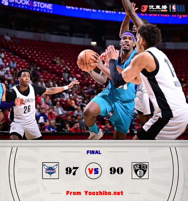 24直播网 7月22日讯 NBA夏季联赛排位赛,黄蜂对阵篮网。比赛开始,黄蜂外线连续发炮打出8-2开局,但篮网马上回应7-0小高潮,双方命中率一般,克洛尼和泰瑞斯-马丁接连三分命中助篮网首节反超2分,次节打了2分多钟黄蜂才打破僵局,双方继续展开拉锯战,斯莱特接连三分半场怒轰21分帮助黄蜂重新取得2分领先。下半场,斯莱特继续火热手感,带领黄蜂一波15-2超级进攻波重新拉开双位数领先,但篮网外线多点开花接连5记三分再次咬住比分,三节黄蜂领先6分,末节篮网接连攻击内线一度又反超1分,但黄蜂接连外线一波11-0重新掌握双位数领先,最终黄蜂97-90力克篮网。