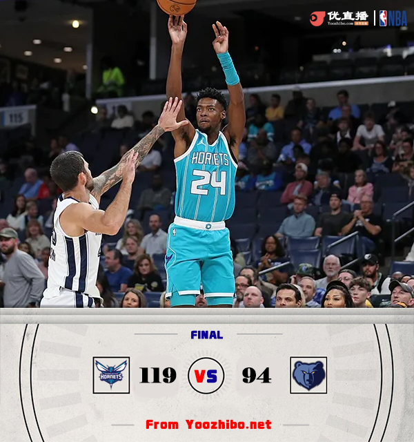 24直播网10月11日讯 NBA季前赛,灰熊对阵黄蜂。上半场,双方势均力敌,比分交替领先,黄蜂外线开火三分7连击取得两位数领先,灰熊连中三分努力追赶,半场战罢黄蜂62-49领先灰熊。易边再战,灰熊奋力反击打出12-0的攻击波,灰熊2记三分稳住局势,末节黄蜂一波9-1再度扩大优势分差,灰熊进攻端命中率下降,黄蜂越战越勇。最终,黄蜂119-94大胜灰熊。