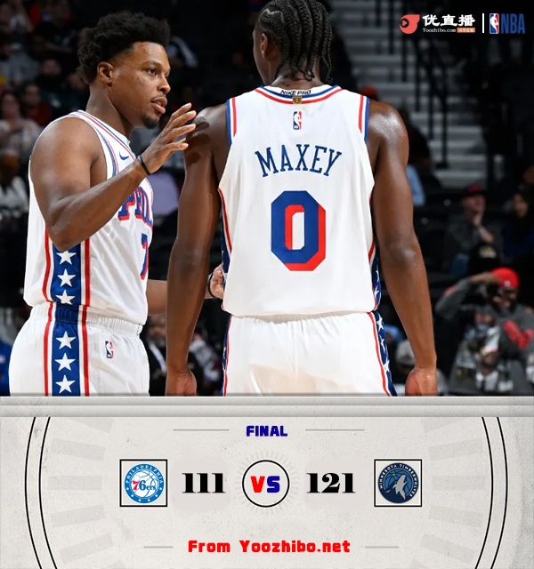 24直播网10月12日讯 NBA季前赛,森林狼对阵76人。76人新援乔治迎来首秀,恩比德缺阵。比赛开始,森林狼率先发力取得领先,76人内外开花努力追赶,次节76人进攻断电,森林狼一波15-4一度获得20分的优势,乔治独中3记三分艰难止血,半场战罢森林狼70-53领先76人。易边再战,马克西和乔治联手带队缩小分差,76人一度将比分迫近到只剩3分,此后双方均使用轮换阵容,末节双方陷入缠斗,比分咬得很紧,关键时刻森林狼连续拿分锁定胜局。最终,76人111-121不敌森林狼。