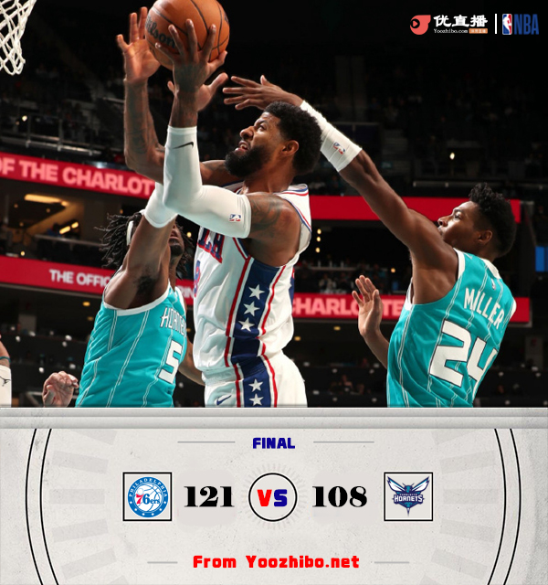 24直播网12月17日讯 NBA常规赛,黄蜂主场迎战76人,黄蜂目前7胜18负排在东部第13位,而76人则是7胜16负排名东部第12。本场比赛,三球迎来复出。比赛开始,76人反客为主打出7-0开局,黄蜂接连三分回应8-0,但马克西接连中远投再打出8-0,随后乔治接连不讲理三分,首节76人领先8分,次节76人进攻还是靠乔治和马克西撑起,二人连续不讲理三分稳住10分左右领先,但末段三球接连助飞小桥空接暴扣,黄蜂半场追到差5分。下半场,黄蜂开始追分,但76人外线神准总能回应,并重新拉开双位数领先,随后76人替补继续发力拉开20分以上领先,末节黄蜂上来7-0追到差个位数分差,但随后黄蜂没有把握住机会,米勒还崴脚伤退,乌布雷和乔治接连三分,76人一波8-0重新稳住局势,最终76人121-108力克黄蜂。