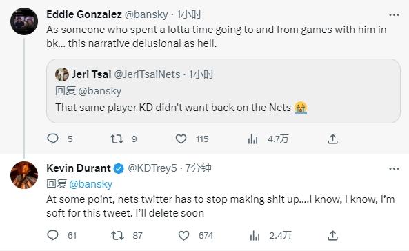 杜兰特本人也回应谣言:这些篮网的自媒体真的该停止胡说八道了!我知道,我知道,我发这个推特显得我很软,我马上就会删掉的。