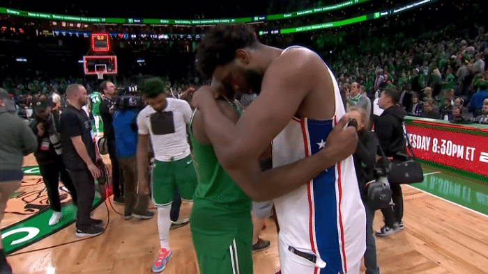 比赛沦为垃圾时间后,恩比德和哈登坐在替补席都十分沮丧,赛后哈登一脸不开心,仍拥抱对手表达尊重;恩比德也拥抱对手,拥抱塔图姆和布朗时咧嘴大笑,大度祝贺对手。