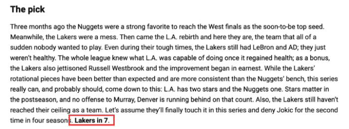 湖人西决再次遇到掘金,NBA官网预测湖人西决4-3淘汰掘金从而夺得西部冠军,詹姆斯将在西决系列赛冲击新的历史第一里程碑。