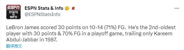 詹姆斯又创一项历史纪录,老詹成为联盟历史上季后赛单场30分+70%投篮命中率的第二老球员,仅次于卡里姆-阿卜杜尔-贾巴尔(1987年);换言之,詹姆斯成为NBA近36年最老达成如此成就的球员。