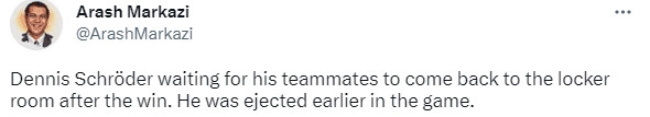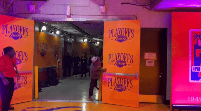据报道,在湖人获胜后,施罗德光着脚站在球员通道的拐角处偷偷关注队友,然后又光脚走回更衣室,湖人工作人员为他鼓掌;很明显,施罗德早已坐不住了,想和队友一起庆祝晋级西决。