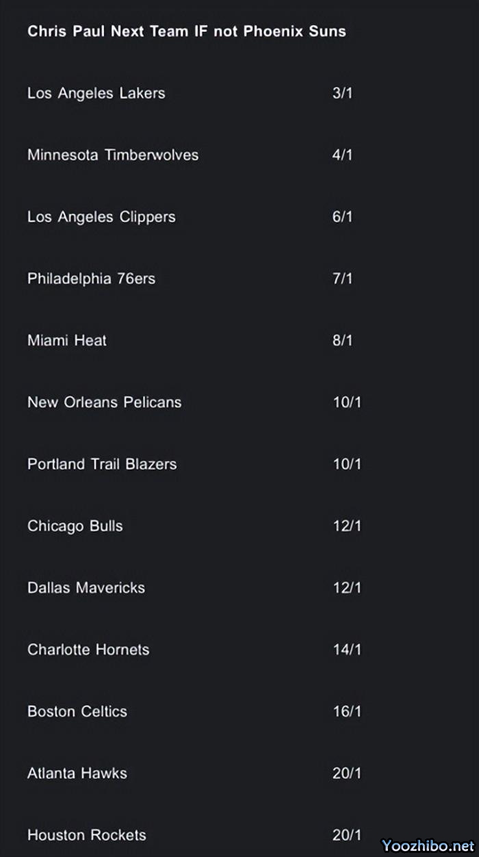 来源:24直播网05-13 11:4224直播网05月13日,名记Tim MacMahon报道称,太阳预计将在今年夏天积极兜售克里斯-保罗,保罗下赛季很可能会在一支不同的球队打球。 保罗本人回应交易流言,而他的最新下家赔率出炉:湖人成为头号热门。CP3有望联手好友詹姆斯再冲冠?