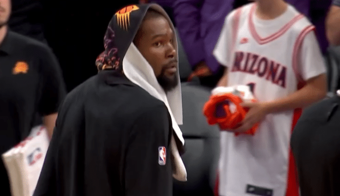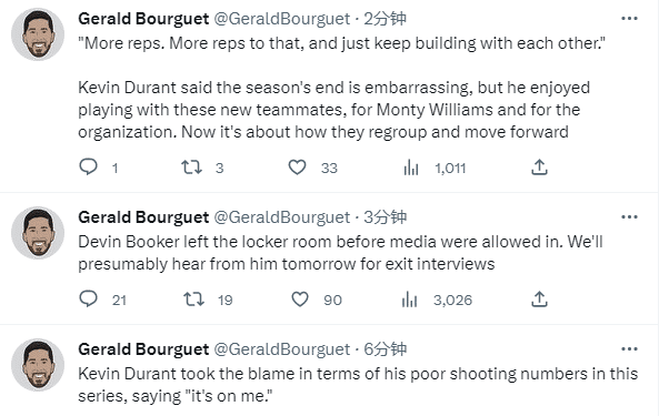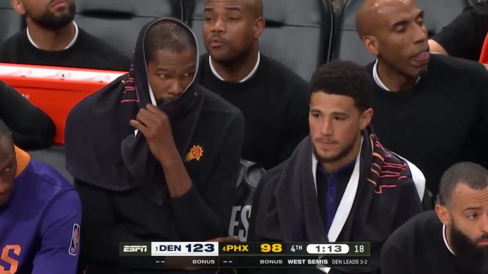 杜兰特坐在替补席时脸色铁青,内心的沮丧和失落全都写在脸上,赛后,杜兰特拥抱掘金主帅马龙、约基奇、小布朗等人,然后黯然离场;布克同样十分伤心,据太阳记者报道,布克赛后未接受采访就提前离开球馆,预计他将在明天接受采访。