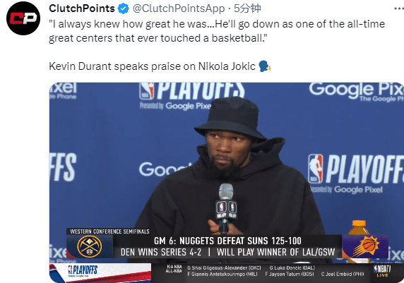 杜兰特夸赞约基奇:我对约基奇充满了尊重,他的表现我一点也不惊讶,约基奇会是篮球史上的最佳中锋之一。