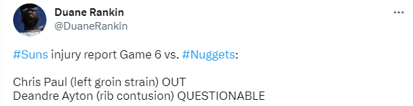 太阳官宣保罗因伤缺席G6生死战,腹股沟拉伤后连续缺席4场比赛,虽然保罗已经参加投篮训练,但他还无法重返赛场;在太阳和掘金G2比赛中,保罗不幸拉伤腹股沟;检查后太阳宣布保罗至少伤停一周,可保罗已经休养一周,仍旧缺席生死战。