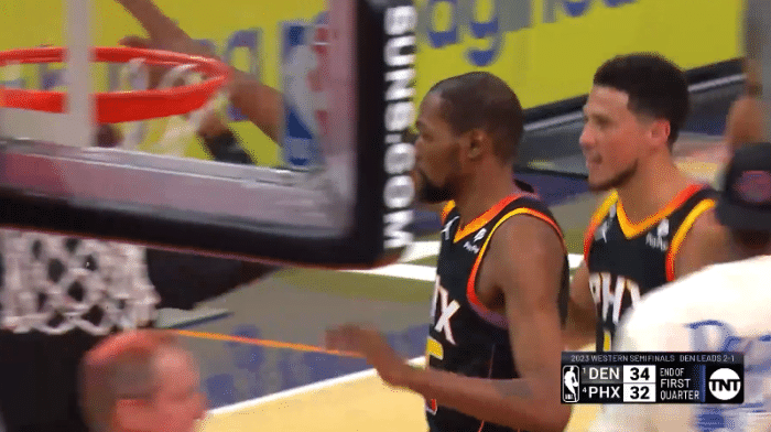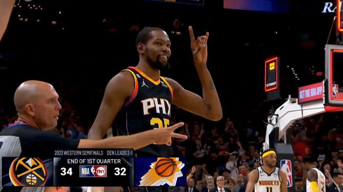 杜兰特和布克两人开场接连拿到11分,率队13-10取得领先,之后太阳进攻哑火,杜兰特中投和三分都打铁,被掘金打出13-2攻势,太阳落后8分后杜兰特招牌后仰得分打破得分荒,之后险晃倒穆雷突破造犯规两罚全中,掘金回应5-0,KD下场后布克带队追分,第一节最后2.7秒,布克四分卫式长传助攻杜兰特打进压哨球。