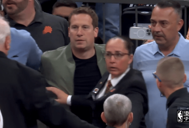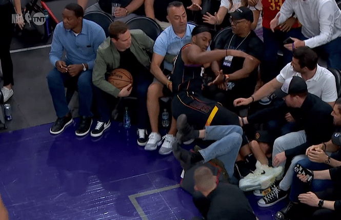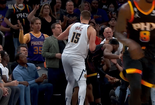 掘金太阳场边冲突一幕:约基奇抢球推倒太阳老板吃T 一球迷遭驱逐