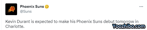 杜兰特首秀的日子,也将是太阳四巨头首次合体的日子,他们并肩对阵排在东部倒数第二的黄蜂,而且黄蜂球星三球因脚踝骨折提前赛季报销,换言之,太阳是想拿黄蜂演练阵容。