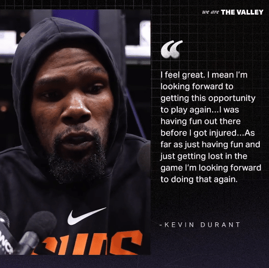对于即将重返赛场,杜兰特表示:我感觉非常好,我的意思是,我很期待再次有机会上场打球,在受伤之前,我很享受在场上打球的时光,我很期待继续这样做,在比赛中找到乐趣,享受比赛。