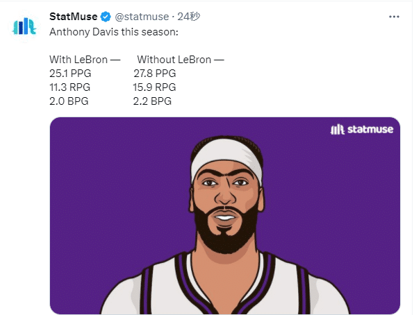 据统计,本赛季詹眉同时出战时,浓眉场均拿到25.1分11.3篮板2盖帽,没有詹姆斯时,浓眉场均拿到27.8分15.9篮板2.2盖帽,换言之,詹姆斯伤停,浓眉有望大爆发,带队全力冲击季后赛。