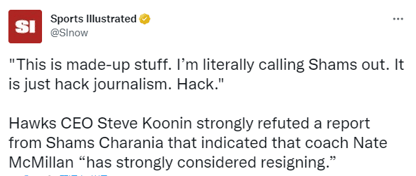 对此,老鹰总经理Steve Koonin公开辟谣,表示:这是编造的东西。我真的在叫Shams出来,这只是造谣,造谣。