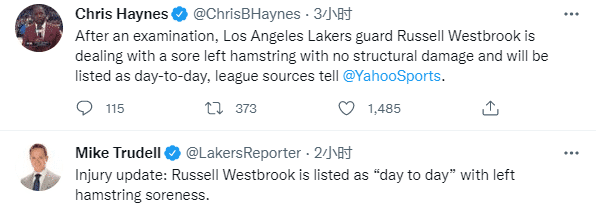 威少最新伤情出炉:腿筋无结构性损伤 常规赛湖人会继续让他替补