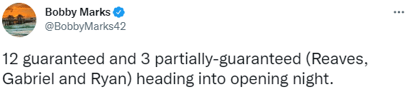 湖人队拥有12分保障合同和3份无保障合同(里夫斯、加布里埃尔和里安)。
