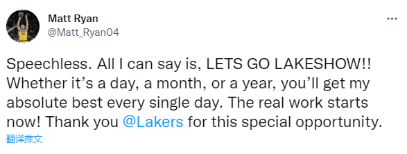 马特-里安留队后激动发推:难以言表的激动,我只能说,湖人冲呀!!不管是一天,一个月还是一年,我都会保持最佳状态来对待每一天。真正的工作现在开始,感谢湖人给我这次特别的机会。
