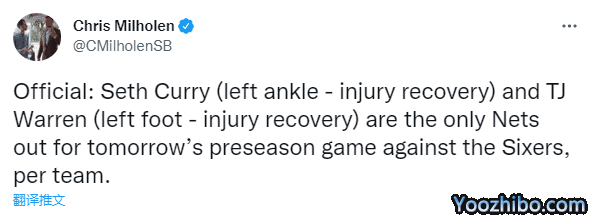来源:24直播网10-03 12:2824直播网10月03日讯,篮网季前赛对阵费城76人的伤情报告出炉,篮网队两人因伤缺席比赛,赛斯-库里(左脚踝,伤病康复)和TJ-沃伦(左脚,伤病康复)因伤休战,篮网其他球员都可以出战;杜兰特、欧文和西蒙斯三巨头带队出战,西蒙斯迎来篮网生涯首秀。