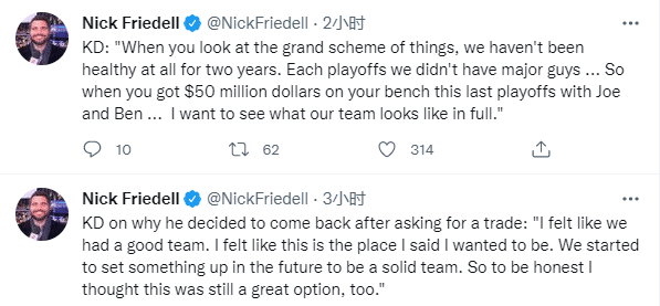 对于决定留守篮网,杜兰特称赞了球队休赛期运作,并表示球队新增了很多有实力的球员,他们是自己愿意回到布鲁克林的原因之一。