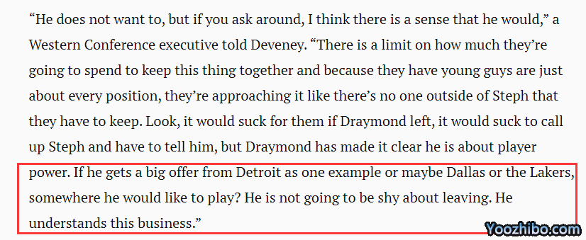据报道,该联盟高管透露:如果追梦从他想效力的球队那里收到丰厚报价,比如活塞、独行侠、湖人。那么他会离开勇士(not shy about leaving)“。他明白这是生意;如果格林离队,他们会糟糕,库里的心情也会很糟糕。