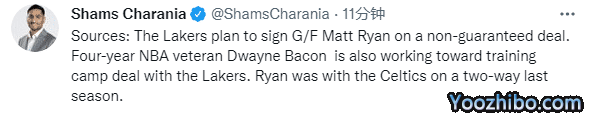 来源:24直播网09-26 15:2924直播网09月26日,湖人官方裁掉一人后连续签下两名球员,据名记Shams报道,湖人计划以非保障合同签下马特-瑞安,还用训练营合同签德维恩-培根;湖人20人大名单满额,三巨头领衔冲冠。
