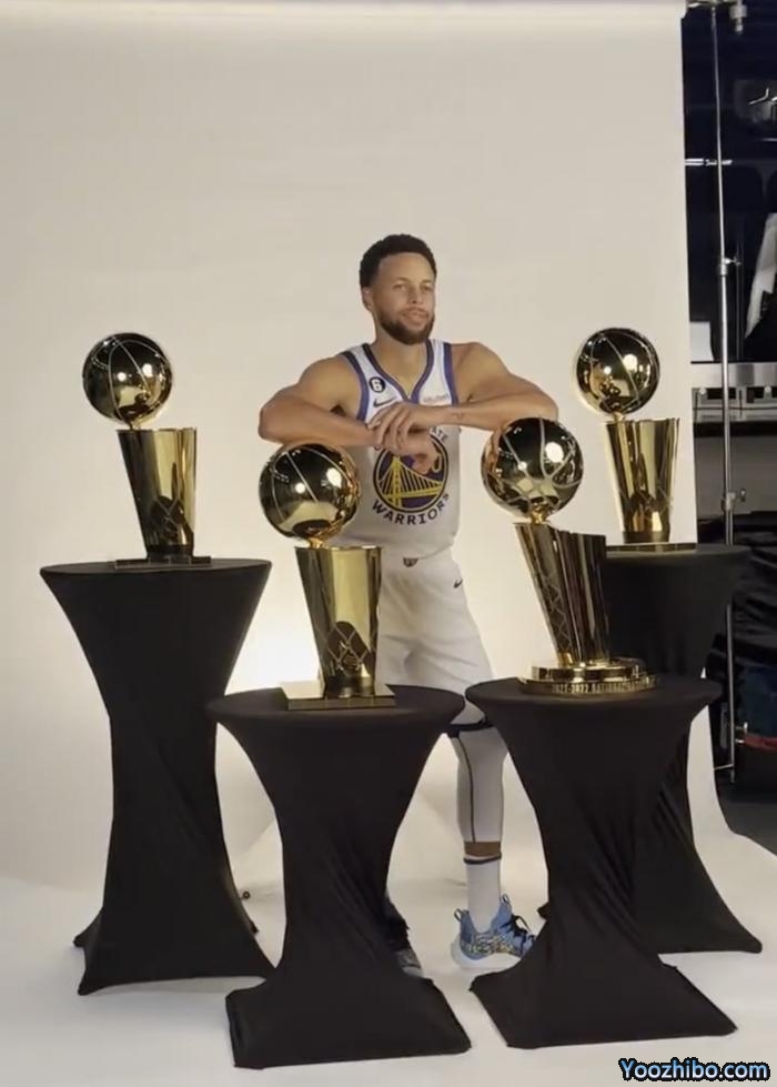库里身穿印有拉塞尔6号的新款球衣出镜,先是紧抱双臂,然后把两臂搭在两座总冠军奖杯上,与四座奖杯合影太霸气。