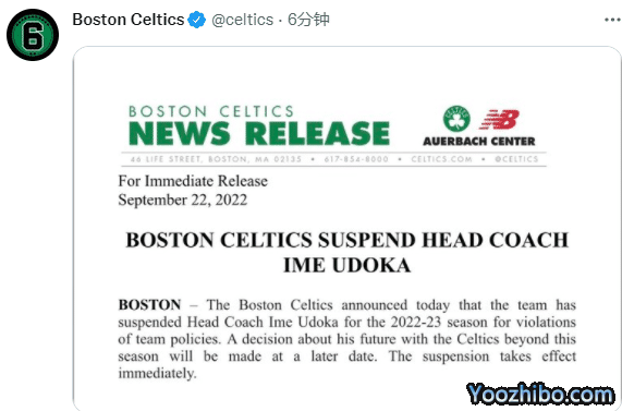 来源:24直播网09-23 11:0424直播网09月22日日,凯尔特人官方正式宣布,乌度卡因违反球队纪律,被球队禁赛整个2022-23赛季,禁赛立即生效;绿军主帅乌度卡因出轨女职员被停职一年,之后乌度卡公开道歉并且表示接受球队的处罚;乌度卡被禁赛整个赛季,乔-马祖拉将担任凯尔特人临时主帅。