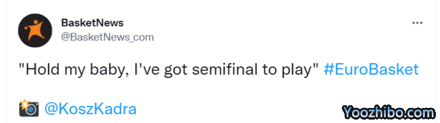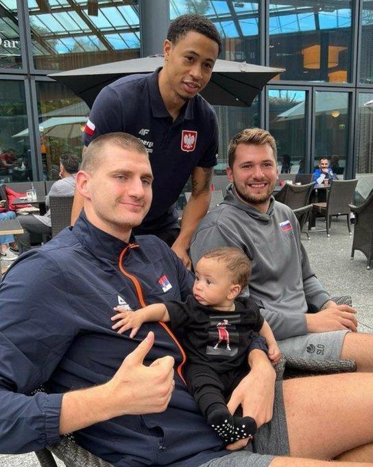 自此,NBA三大巨星东契奇、约基奇和字母哥都被淘汰出局。外媒晒出了一张照片(上图),调侃东契奇和约基奇的淘汰。那是波兰球员斯劳特把自己儿子放在约基奇怀中,来和约基奇、东契奇合影的画面。外媒配文调侃道:“帮我抱下娃,我有半决赛要打。”