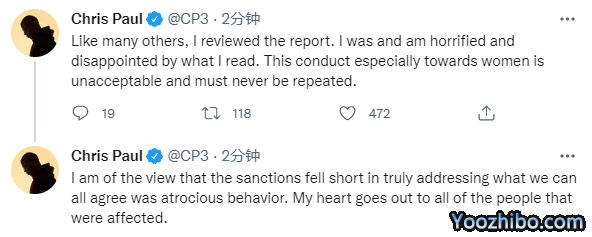 太阳球星保罗发推写道:像许多其他人一样,我审阅了这份报告。我对我所读到的内容感到震惊和失望。这种行为,尤其是针对女性的行为是不可接受的,绝对不能重蹈覆辙;我认为,制裁未能真正解决我们大家都认为是残暴行为的问题。我向所有受影响的人表示同情。