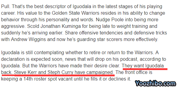 伊戈达拉对担任教练没有兴趣,因为勇士留下一哥的唯一办法就是给他一个阵容名额;目前勇士新赛季训练营大名单上已经有19名球员,包括14名拥有正式合同的球员,这最后一个名额就是留给伊戈达拉的,勇士全队都在等待一哥做出最终的决定——退役或再战一年。