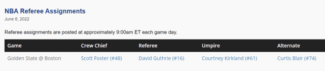 来源:24直播网06-09 16:3924直播网06月09日讯 ,NBA官方公布了总决赛G3的裁判名单,他们分别是48号裁判斯科特-福斯特,16号裁判大卫-古斯里,61号裁判 考特尼-科克兰德,替补裁判是74号裁判柯蒂斯-布莱尔。
